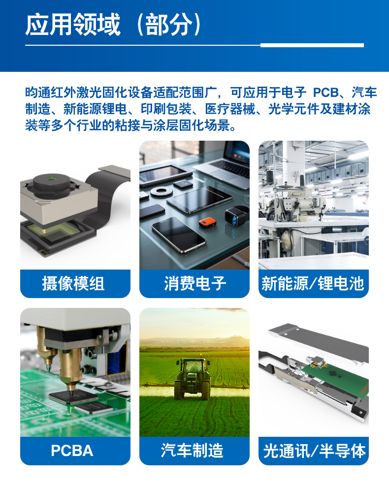 可应用于电子装配、扬声器、油墨、油漆固化、表面涂覆、胶水固化、医疗、光学组装、半导体、3C数码产品、电子零部件、PCB线路板、触摸屏、LED液晶显示屏等基材表面粘合。 |